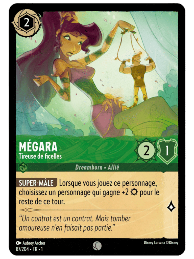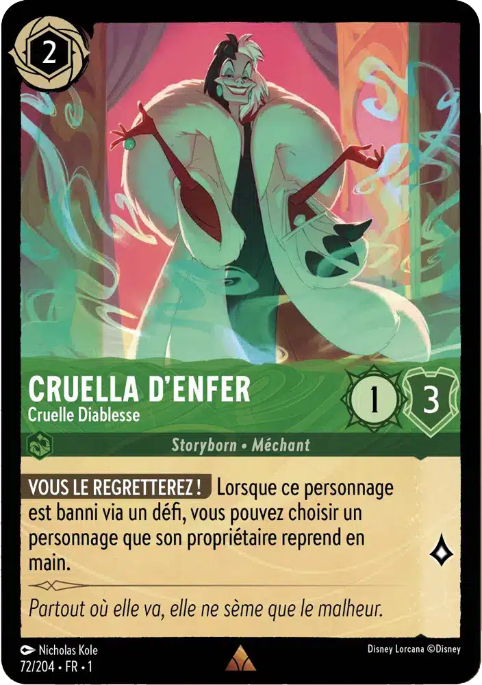Cruella, la Mante Religieuse Maléfique, est l’une des cartes les plus puissantes de Lorcana. Cette icône Disney incarne la cruauté et la manipulation, rendant ses capacités redoutables sur le champ de bataille. Sa rareté élevée en fait un trophée convoité pour les collectionneurs aguerris.