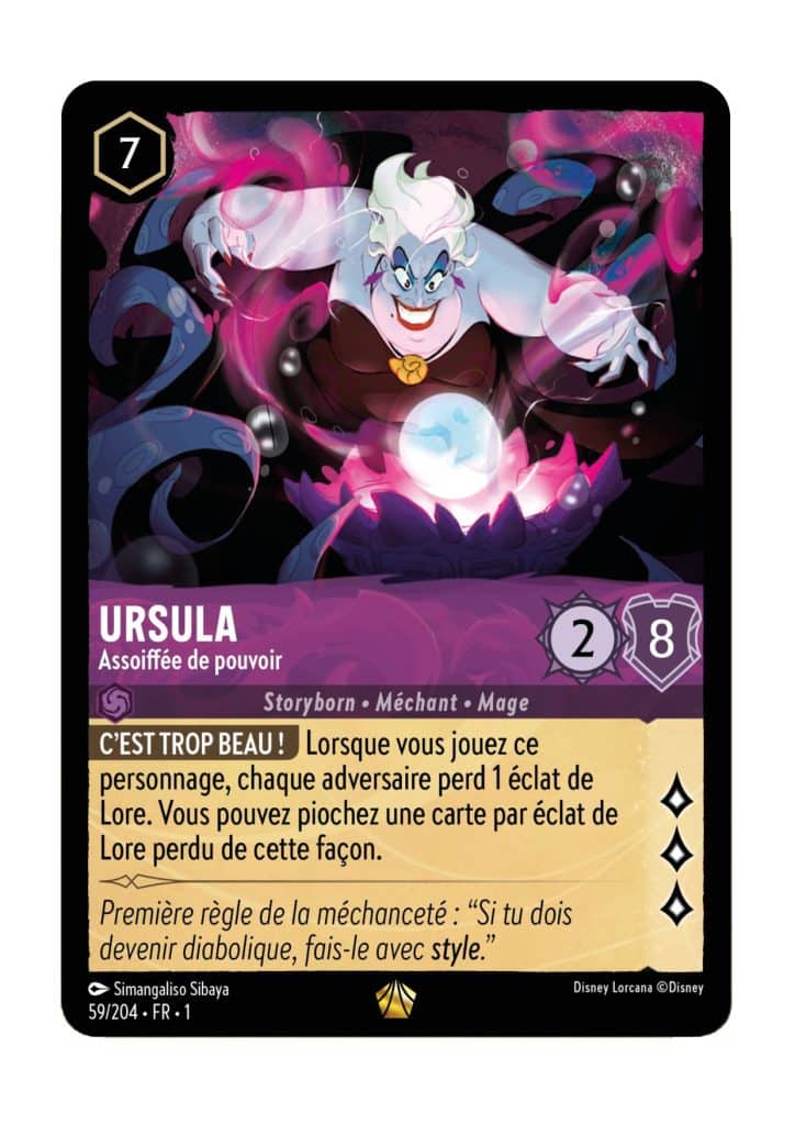 Ursula, la Sorcière des Mers, fait partie des Fleurons Iconiques de Lorcana, les cartes les plus rares et puissantes du jeu. Issue du classique Disney La Petite Sirène, cette carte représente la redoutable antagoniste connue pour son ambition et ses pouvoirs mystiques.