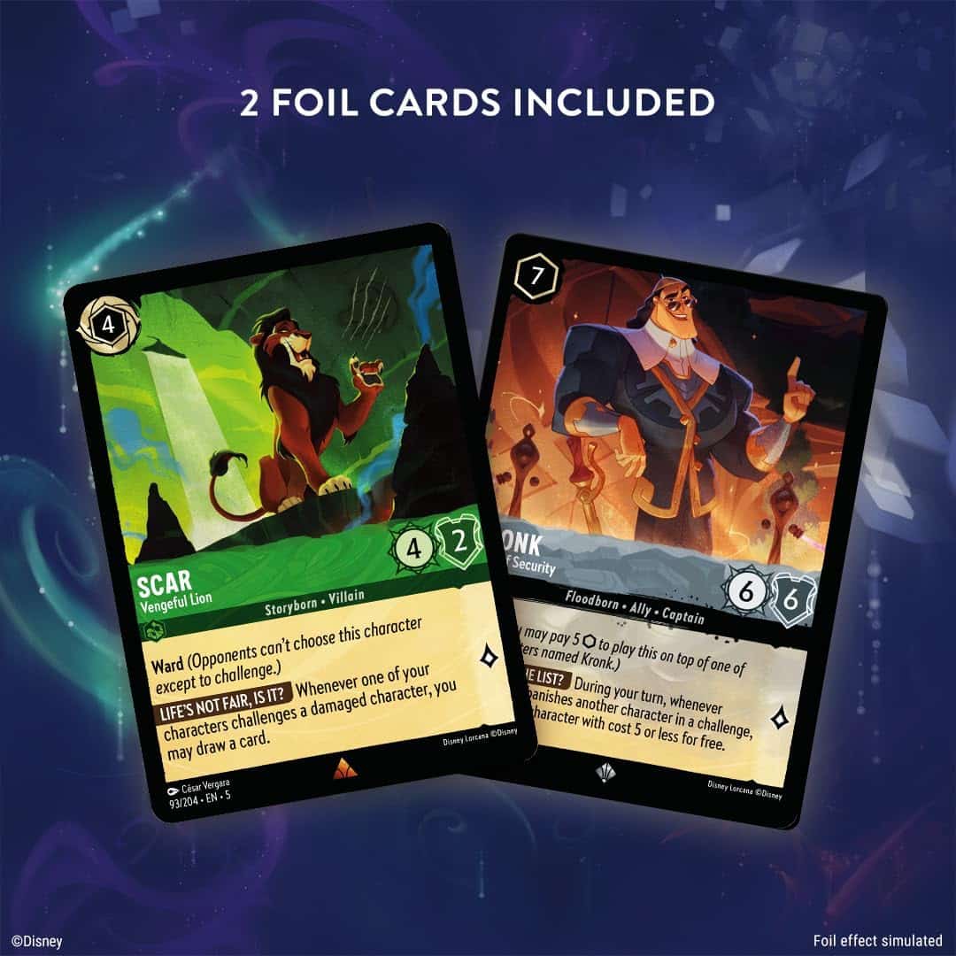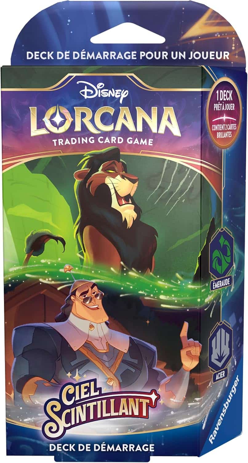La fête bat son plein dans l’univers magique de Lorcana avec ce deck de démarrage Ciel Scintillant – Émeraude & Acier. Mais attention, car les manigances sont aussi de la partie ! Alors que les Glimmers s’émerveillent et se distraient par les festivités, une menace rôde sous les traits du Glimmer Émeraude Scar – Lion revanchard et sa bande de hyènes, bien décidés à semer le chaos et à prendre l’avantage. Heureusement, les festivités sont sous la protection vigilante de Kronk – Chef de la sécurité, dont le rôle est de veiller à ce qu’aucun trouble-fête ne vienne perturber votre stratégie gagnante.